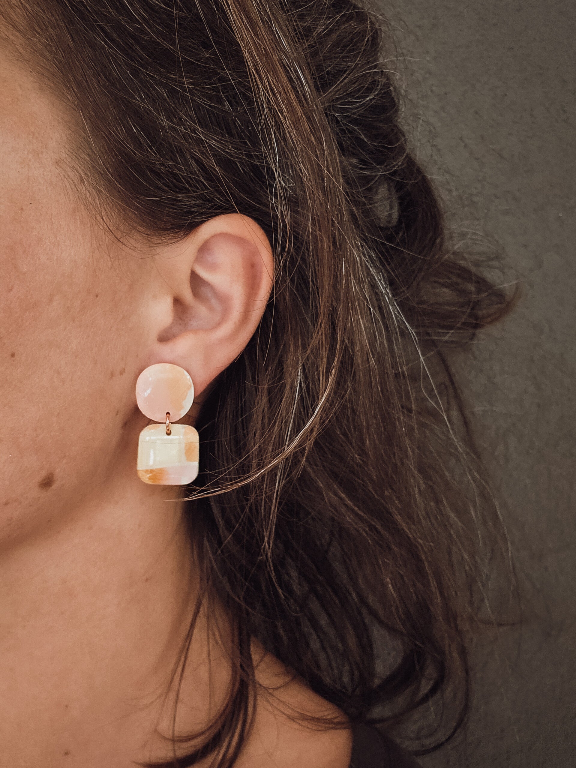 Zachte pastelkleuren roze en oranje; klein en subtiel; zo licht dat je niet voelt dat je iets in je oren draagt.