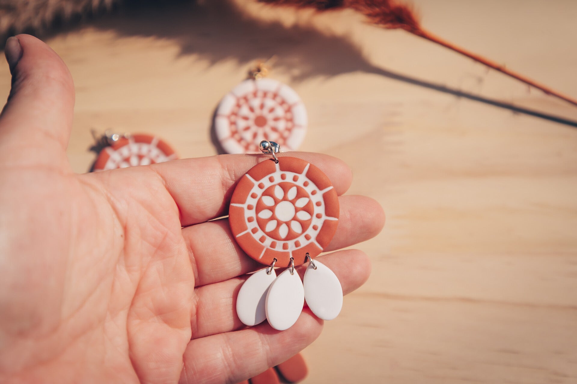 Deze unieke klei oorbellen in terracotta met wit doen denken aan zomerse dromenvangers. Ondanks het opvallende formaat, zijn ze licht in gewicht waardoor je bijna niet door hebt dat je ze draagt.