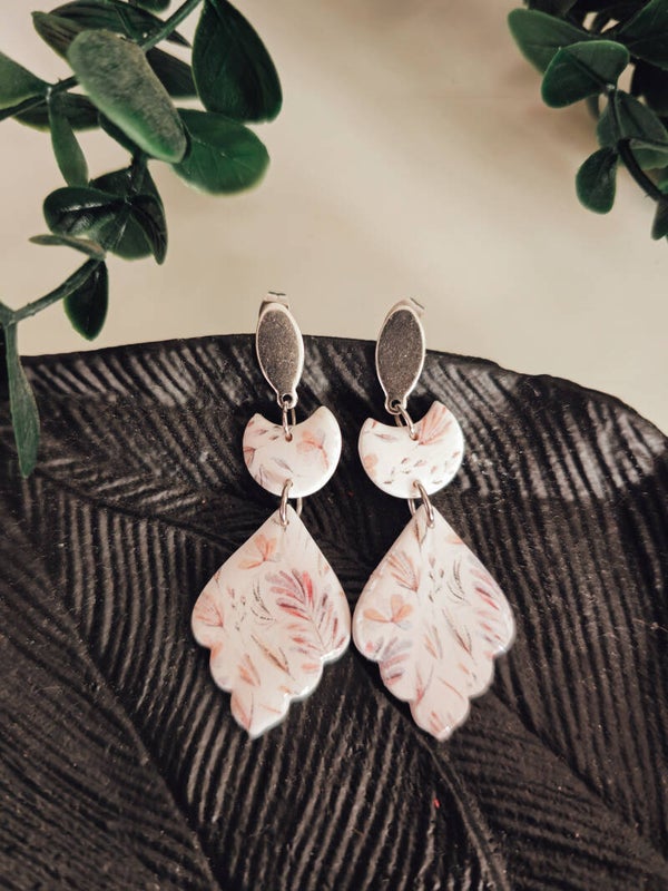 Een verfijnde, dromerige collectie handgemaakte oorbellen met subtiele bladpatronen in zachte kleuren, die lichtheid en rust uitstralen.